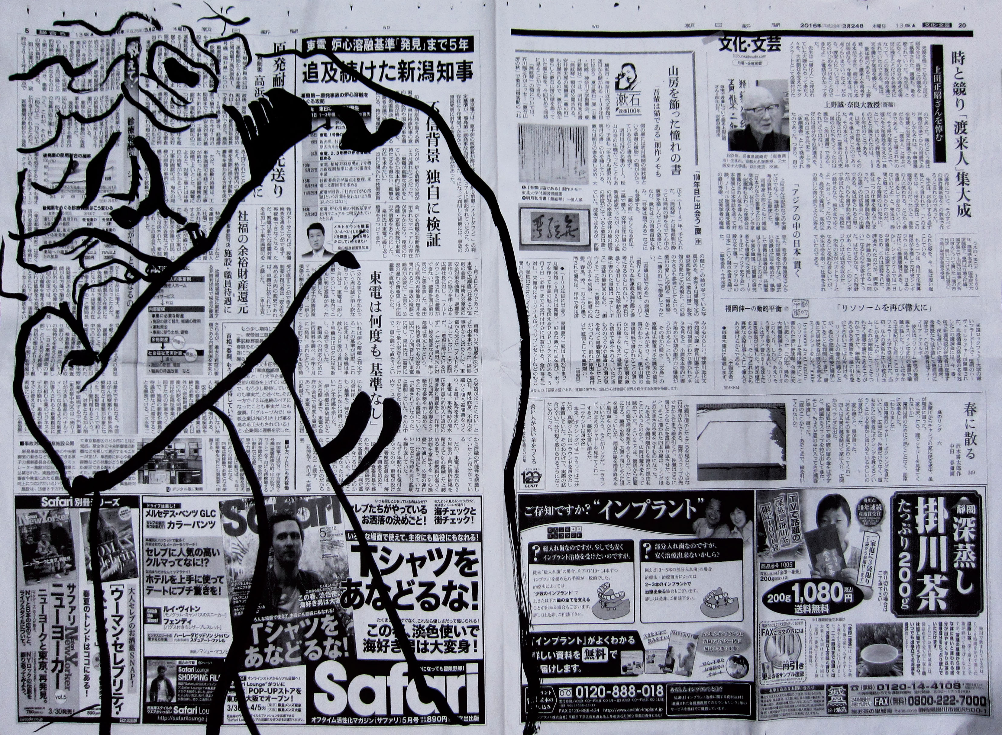 model drawing with ink and white paint on top of a newspaper